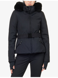 PRODUCT DETAILS - Goldbergh stretch-woven down ski jacket - 74% polyamide, 26% elastane; filling 90% duck down, 10% feathers; lining 100% polyamide; trims 100% polyester - Concealed zip fastening at front - Slim fit, high-neck, detachable faux-fur embellishment at hood, long sleeves, brand plaque at sleeve, zipped cuffs, internal elasticated cuffs, two zip pockets at front, belt loops, two detachable branded belts, all-over padded, fully lined, flared hem, waterproof, breathable, anti-odour - Machine wash at 30°C - True to size - Size UK 8: length 23in / 59cm - Model is 5ft 10in/1.78m and wears a size UK 8 - Midweight, stretchy Ref: R04492723
