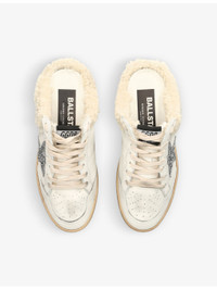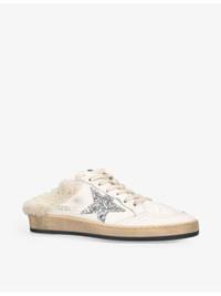 PRODUCT DETAILS - Golden Goose Ballstar Sabots leather-blend trainers - 97% sheepskin leather; 2% polyethylene terephthalate; 1% cotton - Lace-up fastening - Round toe, distressed detail, shearling-rimmed heel and sole, logo-print to side panel - Wipe with a clean, dry cloth - Made in Italy - Upper: 97% sheepskin leather; 2% polyethylene terephthalate; 1% cotton - Lining: 37% sheepskin leather; 33% cow leather; 30% cotton - Sole: 100% rubber Ref: R04089087