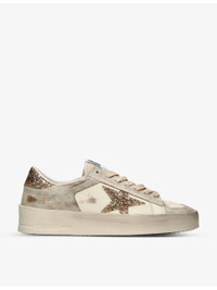 PRODUCT DETAILS - Golden Goose leather trainers - 100% leather - Lace-up fastening - Low top, round closed toe, logo patch at tongue, printed logo at sides and sole, glitter-embellished star-patch at sides, glitter-embellished heel tab, panelled design, worn-out effect - Specialist leather clean - Upper: 100% leather; 36% polyamide, 29% polyethylene terephthalate, 16% cotton, 10% cow leather, 9% sheepskin leather - Lining: 43% cotton, 26% cow leather, 20% textile polyurethane, 6% polyester, 5% viscose - Sole: 100% rubber Ref: R04168728