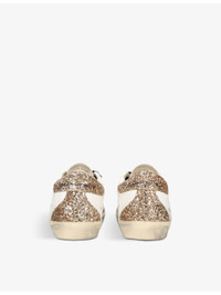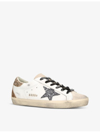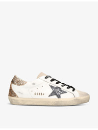 PRODUCT DETAILS - Golden Goose leather low-top trainers - 100% leather - Hook-and-loop tape fastening - Round toe, low-top silhouette, textured upper, contrasting heel tab, contrasting glitter star detail, distressed finish, logo detailing to the sides, tab and midsole, contrasting midsole - Specialist leather clean - Made in Italy - Upper: 100% leather - Lining: 100% textile - Sole: 100% rubber Ref: R04234413
