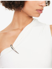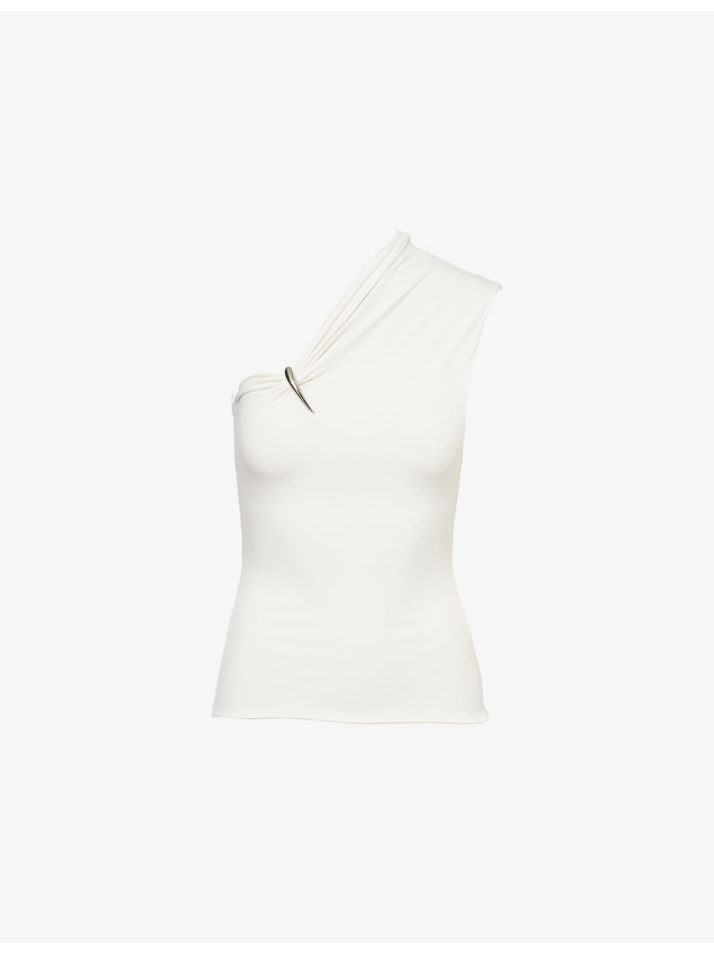 PRODUCT DETAILS - Grace Ling woven top - 92% polyester, 8% elastane - Slim fit, ruched asymmetric neckline, one-shoulder, claw design plaque at front, double layer, flared hem - Hand wash cold - Made in New York - True to size - Model is 5ft 10in/1.78m and wears a size UK 8 - Lightweight, stretchy Ref: R04475649