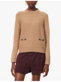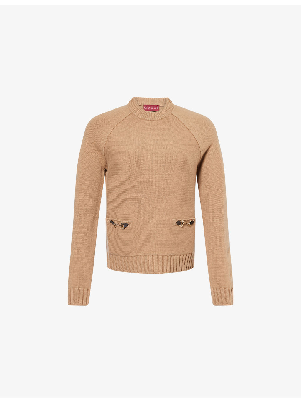 PRODUCT DETAILS - Gucci wool and cashmere-blend jumper - 70% wool, 30% cashmere - Regular fit, round neck, dropped shoulders, long sleeves, ribbed trims, two front faux-welt pockets, gold-toned Horsebit logo embellishments at front, leather trims - Dry clean - Made in Italy - True to size - Model is 5ft 10in/1.78m and wears a size XS - Midweight, stretchy Ref: R04472729
