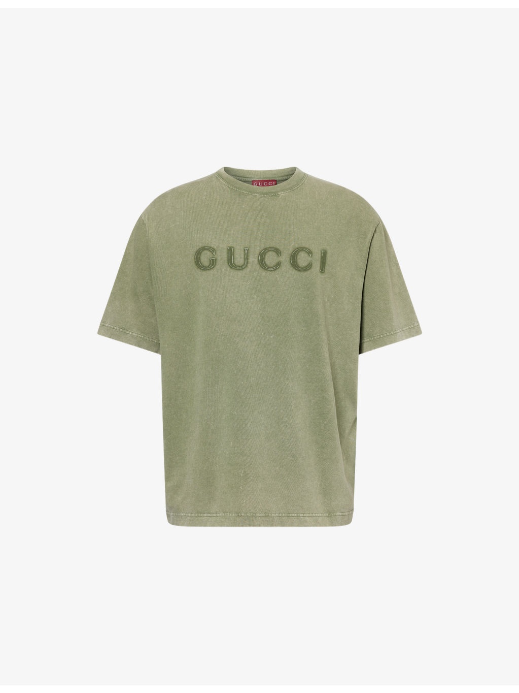 PRODUCT DETAILS - Gucci cotton-jersey T-shirt - 100% cotton - Relaxed fit, crewneck, ribbed trim at neck, dropped shoulders, short sleeves, logo print at front, faded finish - Machine wash at 30°C - Made in Italy - Model is 6ft 2in/1.88m and wears a size medium - Lightweight, non-stretch Ref: R04481444