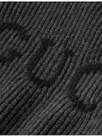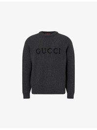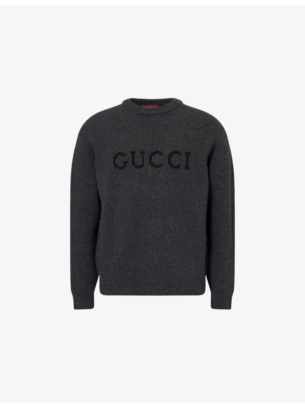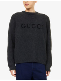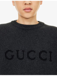 PRODUCT DETAILS - Gucci wool jumper - 70% wool, 30% cashmere - Crewneck, long sleeves, logo print at front, all-over ribbed texture, straight hem - Dry clean - Made in Italy - Model is 6ft 2in/1.88m and wears a size medium - Lightweight, slight stretch Ref: R04481474