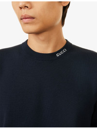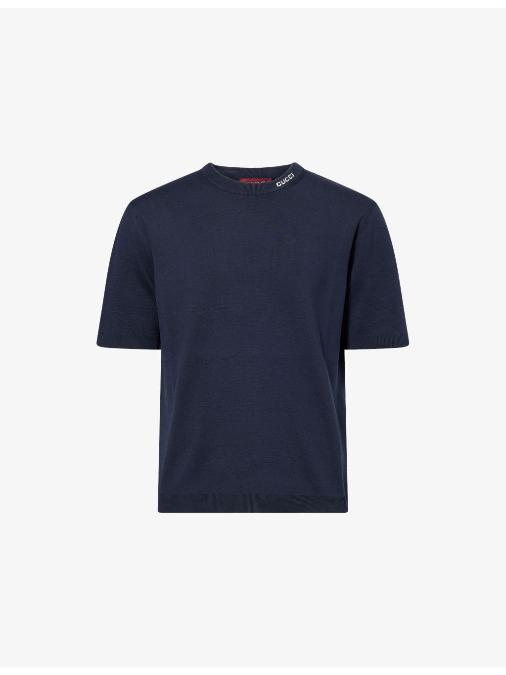 PRODUCT DETAILS - Gucci knitted t-shirt - 55% silk, 45% cotton - Crewneck, short sleeves, knitted logo at neckline, ribbed trims - Dry clean - Made in Italy - Model is 6ft 2in/1.88m and wears a size medium - Midweight, slight stretch Ref: R04481431