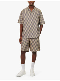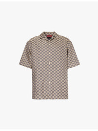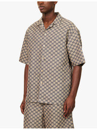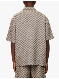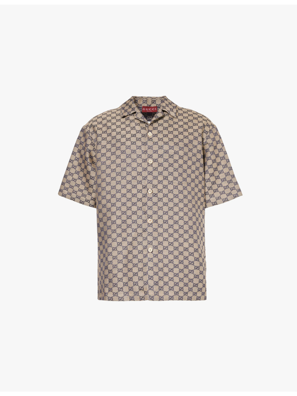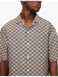 PRODUCT DETAILS - Gucci linen-blend shirt - 68% linen, 32% polyester - Exposed button fastenings at front - Spread collar - Regular fit, short sleeves, patch pocket at chest, split at hem sides, all-over monogram pattern - Specialist dry clean - Made in Italy - Size UK 40: length 31in / 79cm, chest 48in / 122.5cm - Model is 6ft 2in/1.88m and wears a size UK 40 - Midweight, non-stretch Ref: R04327005