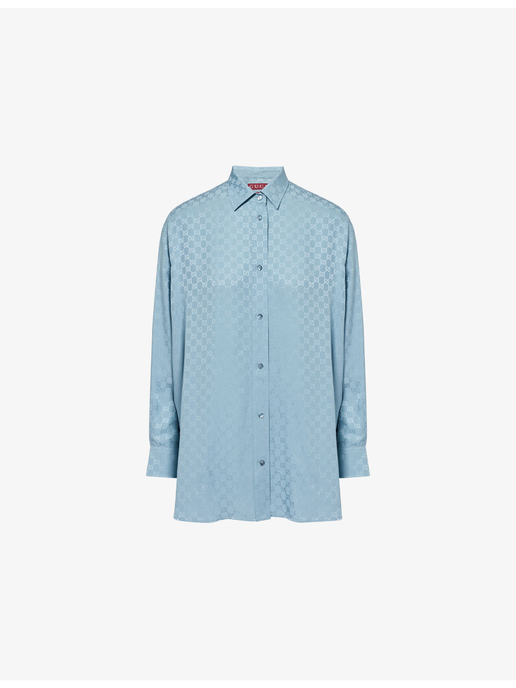 PRODUCT DETAILS - Gucci silk shirt - 100% silk - Exposed button fastening at front - Spread collar - Buttoned cuffs - Relaxed fit, collar, long sleeves, straight yoke at back, all-over monogram print, all-over satin texture, curved hem - Dry clean - Made in Italy - True to size - Size UK 8: length 30in / 76cm - Model is 5ft 10in/1.78m and wears a size UK 8 - Lightweight, stretchy Ref: R04472732