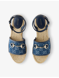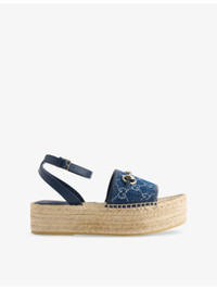 PRODUCT DETAILS - Gucci denim espadrille sandals - 100% cotton; lining 100% textile; sole 100% rubber; upper 100% cotton - Ankle-buckle fastening - Open round toe, chunky strap, all-over GG monogram, gold-tone horsebit at front, branded insole, platform sole with jute rope - Wipe with a clean, dry cloth - Made in Spain - Upper: 100% cotton - Lining: 100% textile - Sole: 100% rubber - Presented in a box, comes with a dust bag Ref: R04391045