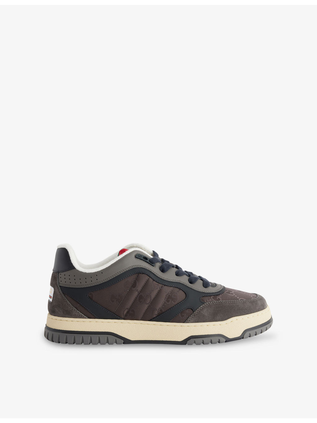PRODUCT DETAILS - Gucci leather and mesh low-top trainers - 100% leather; 100% mesh - Lace-up fastening - Closed round toe, Web stripe at tongue, Gucci script and Interlocking G Web tag, interlocking G details at eyelets, GG canvas panels, patent leather trims, perforated detail, brand tab at heel, chunky serrated sole, extra pair of laces included - Specialist leather clean - Upper: Upper: 100% leather; 100% mesh - Lining: 100% leather - Sole: 100% rubber Ref: R04486733