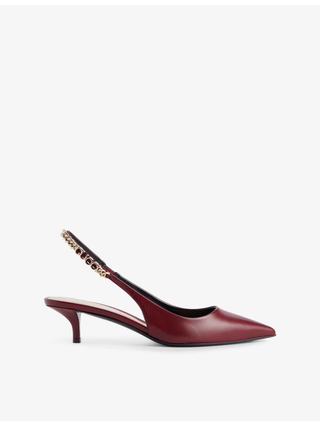 PRODUCT DETAILS - Gucci heeled leather pumps - 100% leather - Slips on - Pointed toe, slingback strap, brand chain and script hardware at strap, patent finish, mid-heel - Heel height 45mm - Specialist leather clean - Made in Italy - Upper: 100% leather - Lining: 100% leather - Sole: 100% leather Ref: R04391015