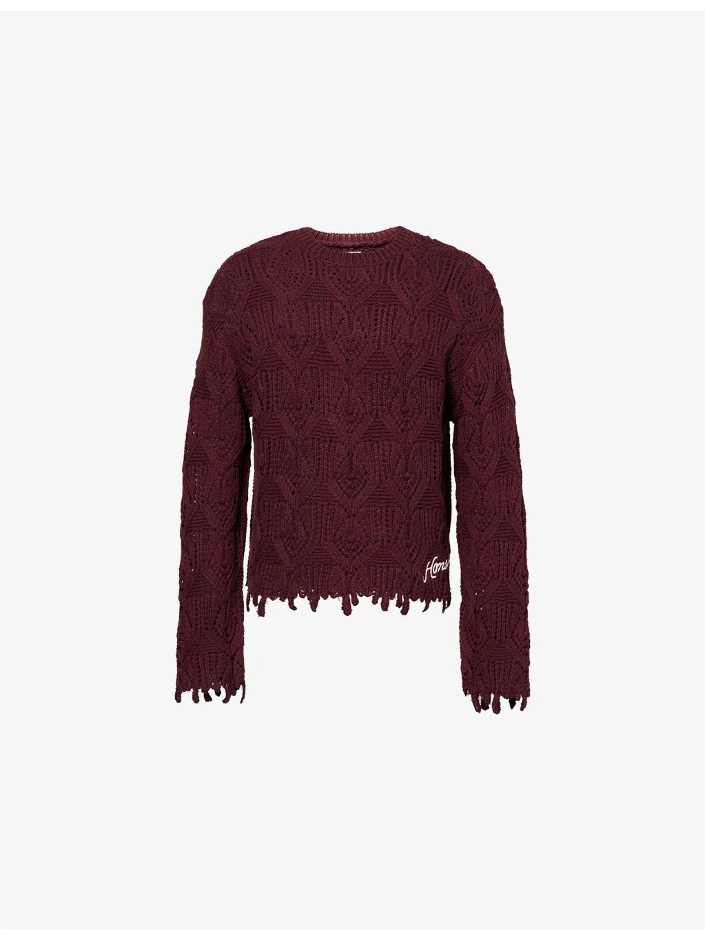 PRODUCT DETAILS - Honor The Gift cotton-blend jumper - 60% cotton, 40% acrylic - Relaxed fit, ribbed crew neck, long sleeves, dropped shoulders, contrast embroidered brand logo at front, all-over cable knit, embroidered 'drip' trims - Machine wash cold - Model is 6ft 2in/1.88m and wears a size medium - Midweight, stretchy Ref: R04538661