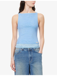 PRODUCT DETAILS - House of Sunny stretch-mesh top - 95% polyester, 5% elastane - Regular fit, boat neck, sleeveless, overlay panel, logo plaque at front - Machine wash at 30°C - True to size - Model is 5ft 10in/1.78m and wears a size UK 8 - Lightweight, stretchy Ref: R04462671