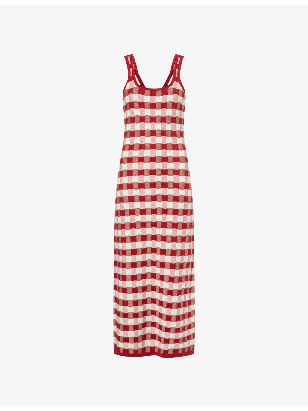PRODUCT DETAILS - House of Sunny cotton-knit midi dress - 100% cotton - Slim fit, scoop neck, adjustable shoulder straps, all-over check-print, all-over knitted, slit at side - Hand wash cold - True to size - Size UK 8: length 50in / 127cm - Model is 5ft 10in/1.78m and wears a size UK 8 - Midweight, stretchy Ref: R04412520