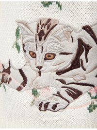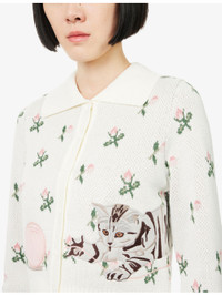 PRODUCT DETAILS - House of Sunny cotton-blend cardigan - 51% cotton, 49% acrylic - Exposed button fastening at front - Relaxed fit, cropped, spread collar, long sleeves, cat patch at front, all-over floral print, all-over knitted, ribbed trims - Hand wash cold - True to size - Size UK 8: length 17in / 44cm - Model is 5ft 10in/1.78m and wears a size UK 8 - Midweight, stretchy Ref: R04515212