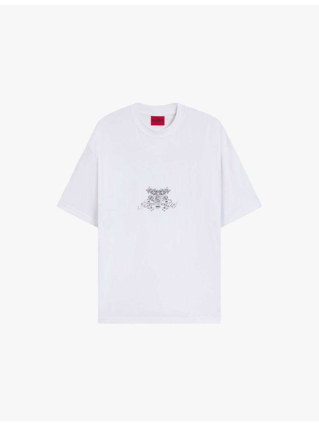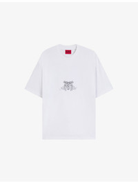 PRODUCT DETAILS - HUGO cotton-jersey T-shirt - 100% cotton - Oversized fit, crewneck, short sleeves, dropped shoulders, collegiate and tapestry-inspired logo print to front and back - Machine wash at 30°C - Model is 6ft 1in/1.85m and wears a size medium - Lightweight, non-stretch Ref: R04488015