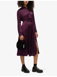 PRODUCT DETAILS - HUGOsatin midi dress - 51% recycled polyester, 49% polyester - Button fastening - Regular fit, collar, long sleeves, buttoned cuffs, pleat front, split at side, unlined, flared hem - Machine wash cold - Model is 5ft 9in/1.75m and wears a size UK 8 - Lightweight, non-stretch Ref: R04285440