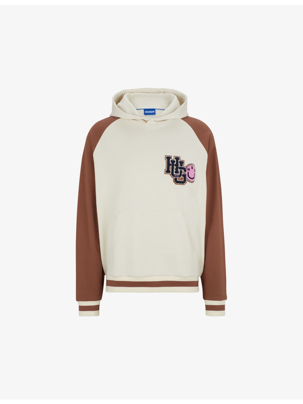 PRODUCT DETAILS - HUGO cotton hoody - 100% cotton - Pulls on - Relaxed fit, hooded, HUGO embroidered varsity patch, contrast raglan sleeves, kangaroo pocket, ribbed trims - Machine wash mild - Midweight, non-stretch Ref: R04252822