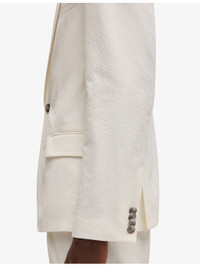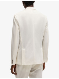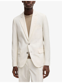 PRODUCT DETAILS - HUGO woven suit - 100% polyester - Button fastening - Blazer: slim fit, single-breasted, notch lapels, side pockets, chest pocket, long sleeves, buttoned cuffs, seersucker texture - Trousers: regular fit, mid-rise, tapered leg, belt loops, side pockets, centre creases - Dry clean - True to size - Model is 6ft 1in/1.85m and wears a size UK 38 - Midweight, non-stretch Ref: R04358466