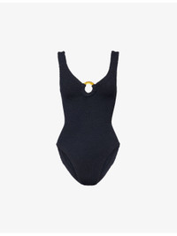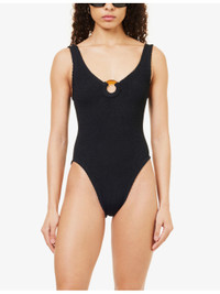 PRODUCT DETAILS - Hunza G swimsuit - 97% polyamide, 3% elastane - Slips on - Plunge neckline, sleeveless, resin hardware at front, low open back, textured, high leg - Machine wash cold - Made in Morocco - Model is 5ft 10in / 1.78m and wears one size - Lightweight, stretchy