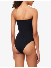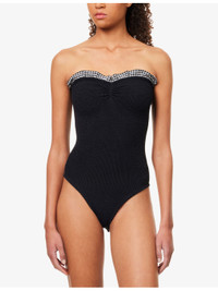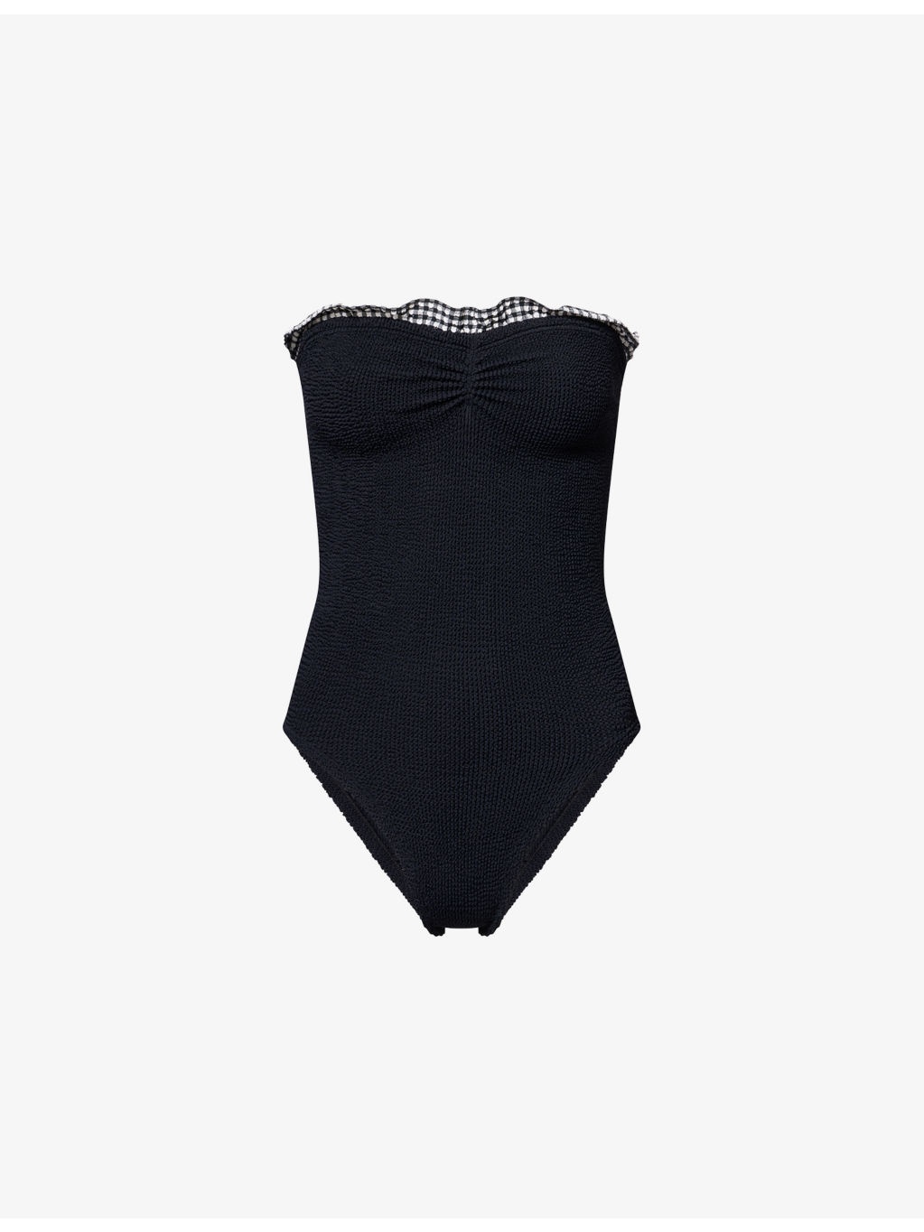 PRODUCT DETAILS - Hunza G swimsuit - 97% polyamide, 3% elastane - Sweetheart neckline, gingham ruffle trim at neckline, strapless, seersucker texture, moderate rear coverage - Hand wash - Made in Morocco - Model is 5ft 10in / 1.78m and wears one size - Lightweight, stretchy - One size fits size UK 6 to 16 - For hygiene reasons, we are unable to exchange or refund this product if the protective adhesive strip has been removed. Ref: R04458698