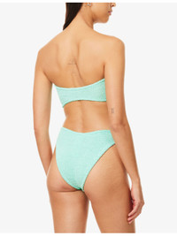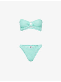 PRODUCT DETAILS - Hunza G bikini set - 97% polyamide, 3% elastane - Top: Triangle shape, pearly ring hardware at front, seersucker texture - Bottom: Mid-rise, pearly hardware at waist, high leg, moderate rear coverage, seersucker texture - Hand wash - Model is 5ft 10in / 1.78m and wears one size - Lightweight, stretchy - One size fits size UK 6 to 16 - For hygiene reasons, we are unable to exchange or refund this product if the protective adhesive strip has been removed. Ref: R04458708