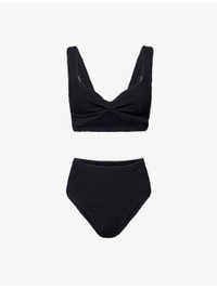 PRODUCT DETAILS - Hunza G bikini set - 97% polyamide, 3% elastane - Top: Triangle shape, twist at front, seersucker texture - Bottom: High-rise, high leg, moderate rear coverage, seersucker texture - Hand wash - Model is 5ft 10in / 1.78m and wears one size - Lightweight, stretchy - One size fits size UK 6 to 16 - For hygiene reasons, we are unable to exchange or refund this product if the protective adhesive strip has been removed. Ref: R04458714