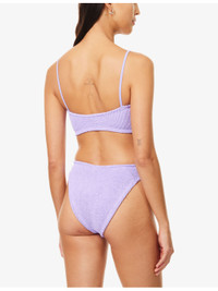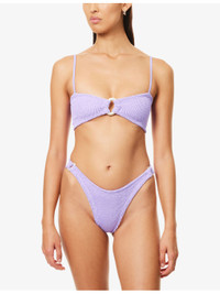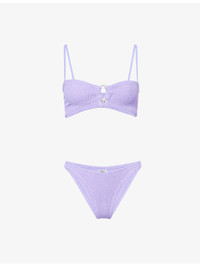 PRODUCT DETAILS - Hunza G bikini set - 97% polyamide, 3% elastane - Top: Bandeau shape, thin straps, gathered pearlescent ring hardware at front, seersucker texture - Bottom: Mid-rise, elasticated waistband with pearlescent ring hardware, high leg, moderate rear coverage, seersucker texture - Machine wash cold - Model is 5ft 10in / 1.78m and wears one size - Lightweight, stretchy - One size fits size UK 6 to 16 - For hygiene reasons, we are unable to exchange or refund this product if the protective adhesive strip has been removed. Ref: R04458704