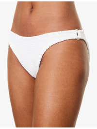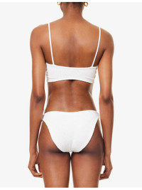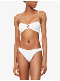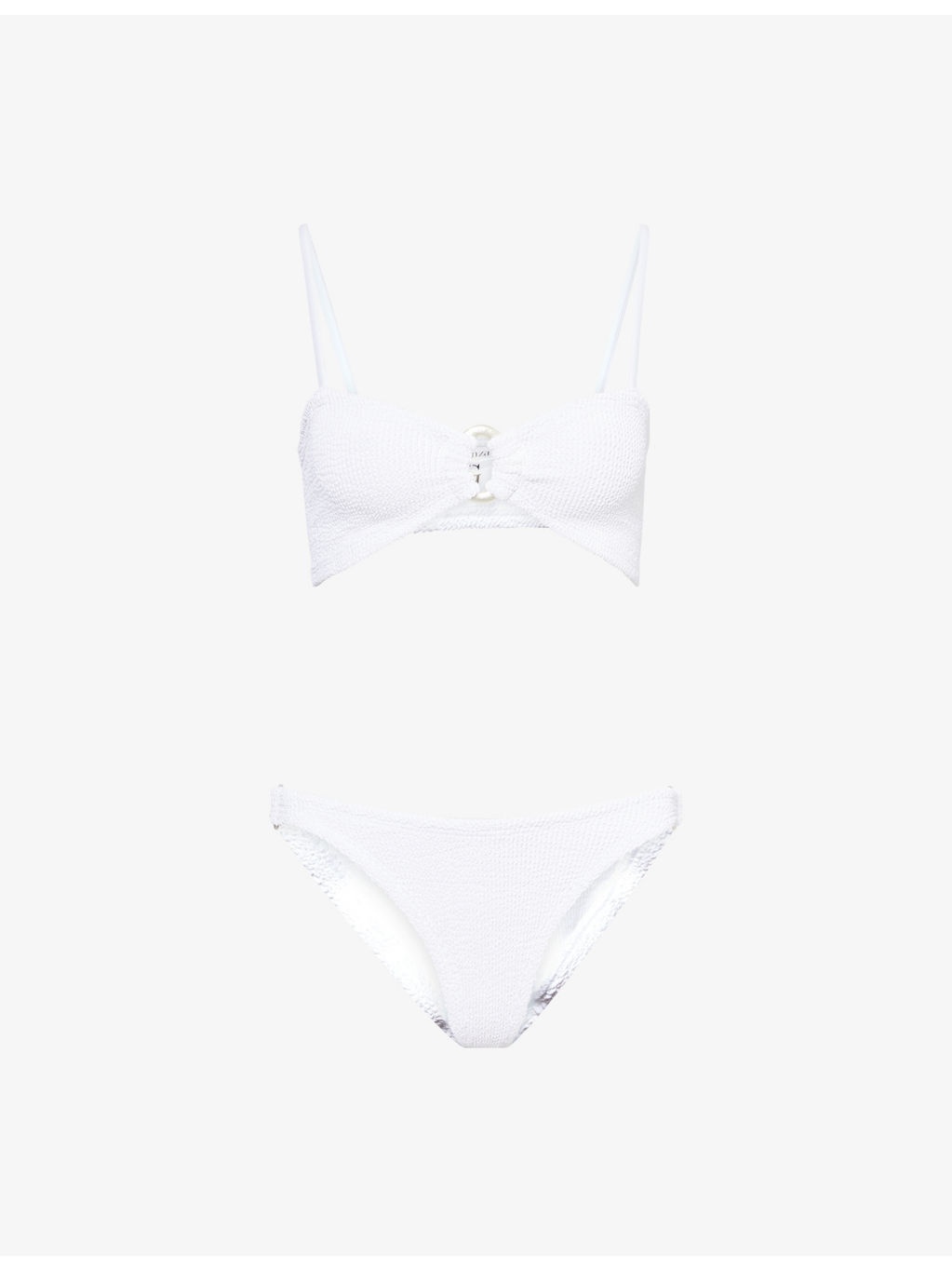 PRODUCT DETAILS - Hunza G bikini set - 97% polyamide, 3% elastane - Top: Bandeau shape, thin straps, gathered pearlescent ring hardware at front, seersucker texture - Bottom: Mid-rise, elasticated waistband with pearlescent ring hardware, high leg, moderate rear coverage, seersucker texture - Machine wash cold - Model is 5ft 10in / 1.78m and wears one size - Lightweight, stretchy - One size fits size UK 6 to 16 - For hygiene reasons, we are unable to exchange or refund this product if the protective adhesive strip has been removed. Ref: R04458704