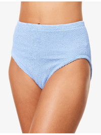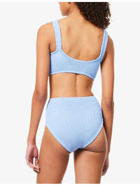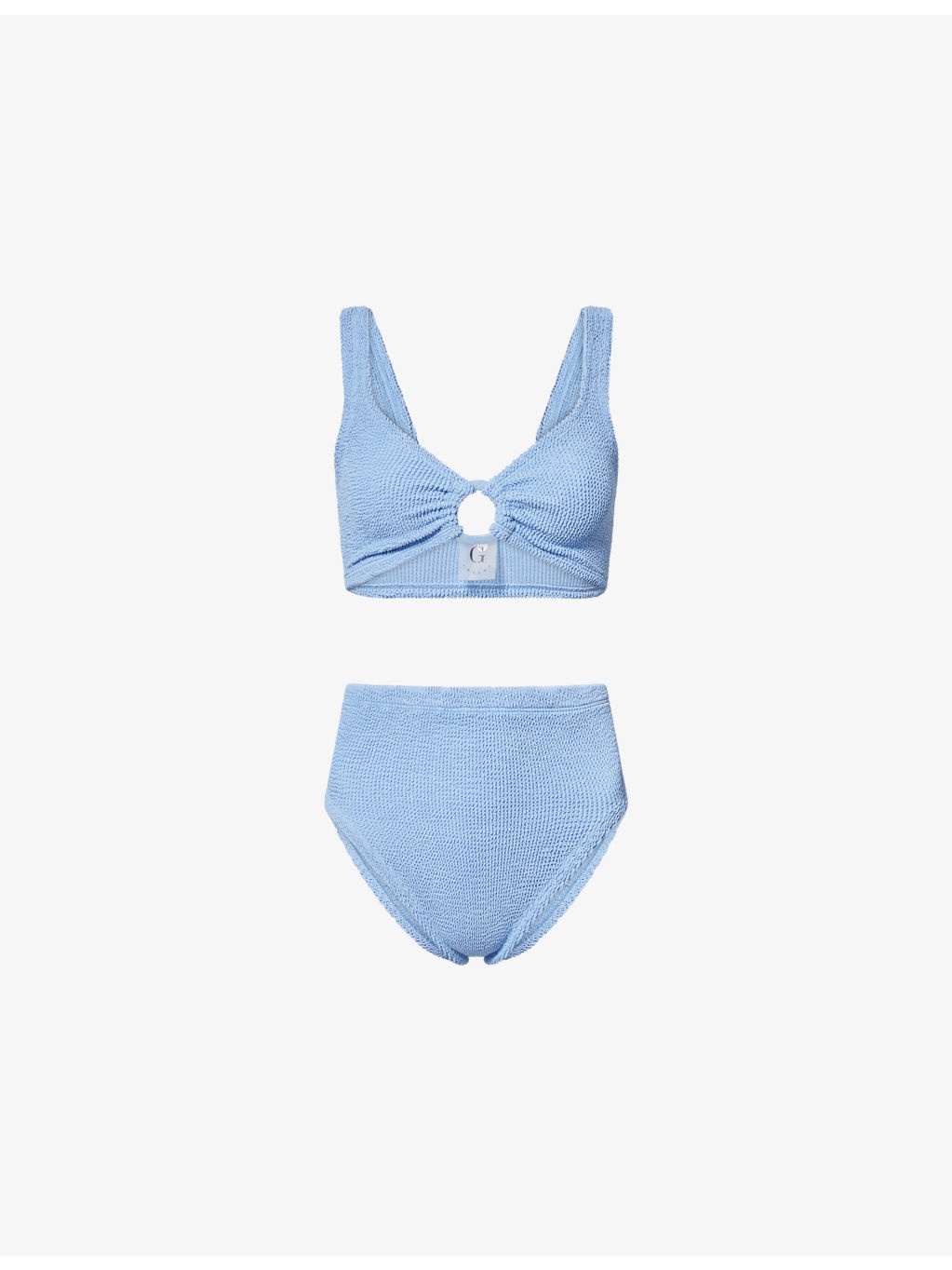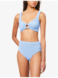 PRODUCT DETAILS - Hunza G woven bikini set - 97% polyamide, 3% elastane - Top: V-neck, shoulder strap, ring embellishment at front, all-over crinkle texture - Bottoms: high-rise, high-leg, mid-coverage at back, all-over crinkle texture - Machine wash at 30°C - Made in Morocco - True to size - Model is 5ft 10in / 1.78m and wears one size - Lightweight, stretchy Ref: R04458712