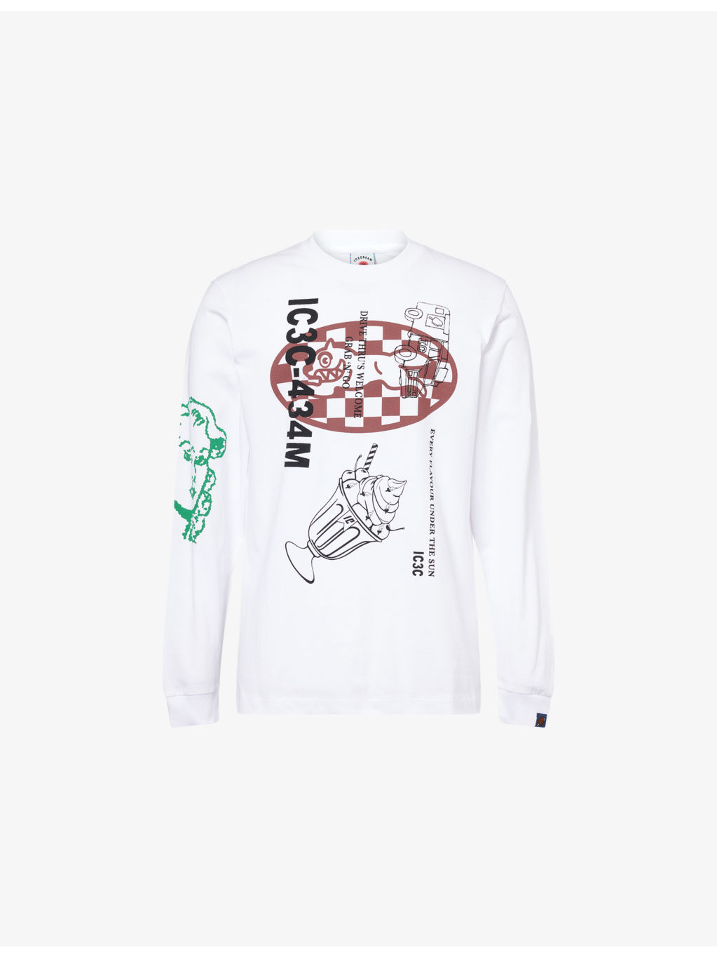 PRODUCT DETAILS - ICECREAM cotton-jersey T-shirt - 100% cotton - Relaxed fit, crewneck, long sleeves, tab at cuff, text and graphic print at front and back, brand print at back, ribbed trims - Machine wash at 30°C - Model is 6ft 2in/1.88m and wears a size medium - Lightweight, stretchy Ref: R04507661