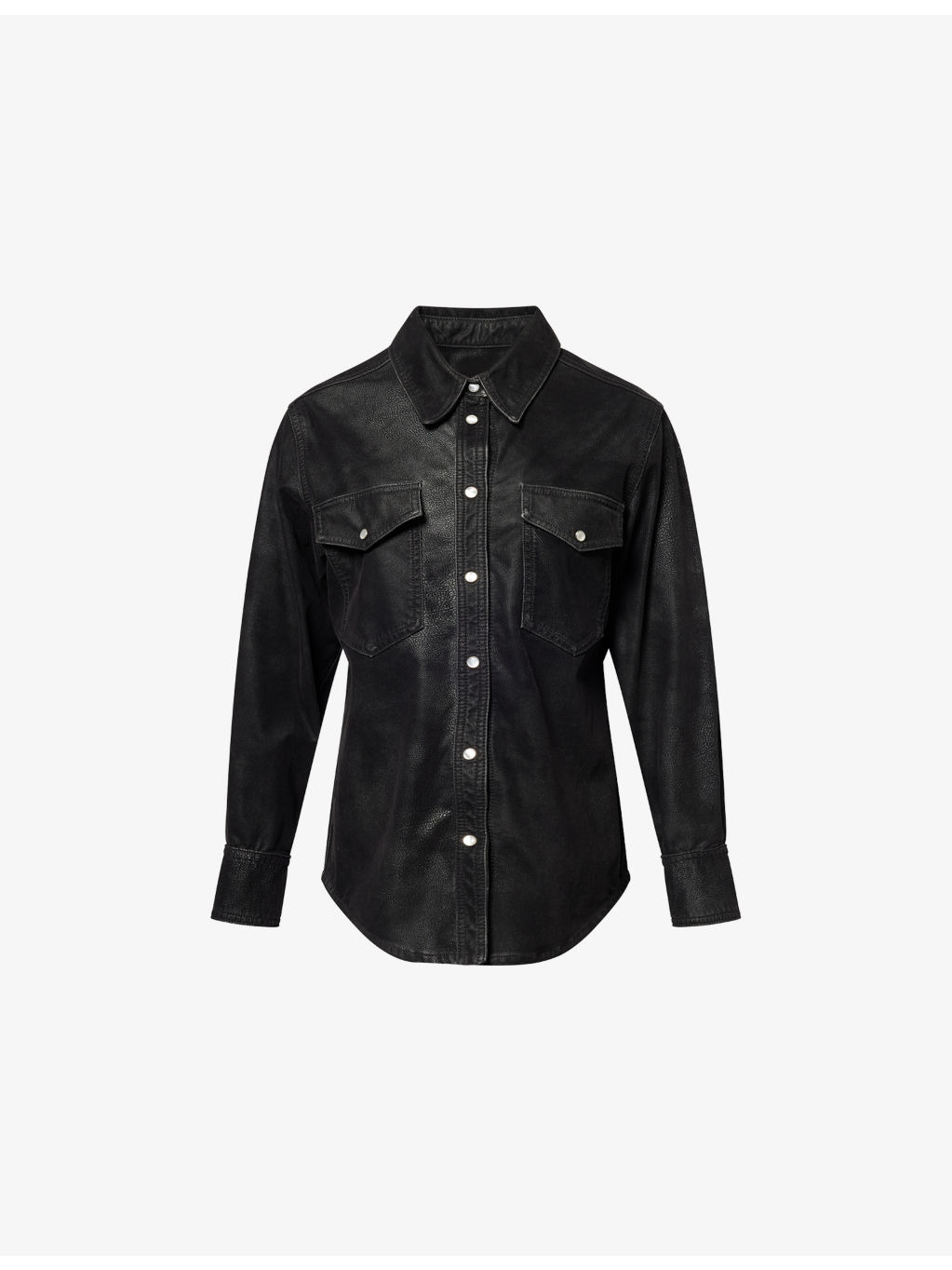 PRODUCT DETAILS - Isabel Marant Etoile woven shirt - 63% polyurethane, 28% viscose, 5% other fibers, 4% polyamide - Popper fastening at front - Spread collar - Buttoned cuffs - Relaxed fit, collar, long sleeves, two buttoned pockets at front, straight yoke and pleat at back, all-over faux-leather texture, curved hem - Machine wash at 30°C - Made in Tunisia - Size UK 10: length 26in / 67cm - Model is 5ft 10in / 1.78m and wears a size UK 10 - Lightweight, slight stretch Ref: R04473581