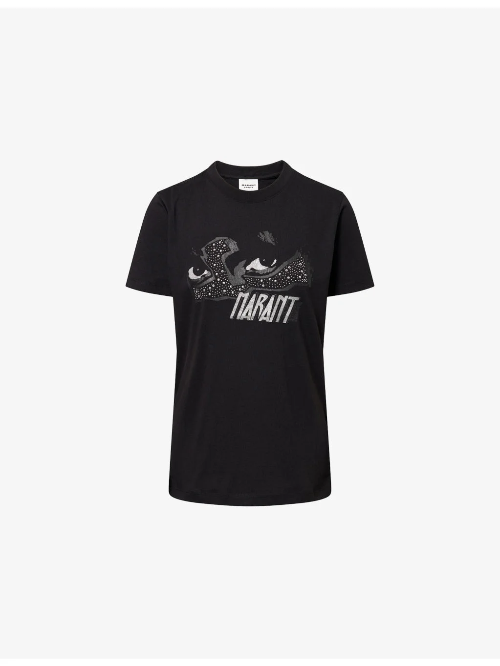 PRODUCT DETAILS - Isabel Marant Etoile cotton-jersey T-shirt - 100% cotton - Relaxed fit, ribbed round-neck, short sleeves, brand print and studs embellishment at front - Machine wash at 30°C - Made in Portugal - True to size - Model is 5ft 10in/1.78m and wears a size small - Lightweight, stretchy Ref: R04540541