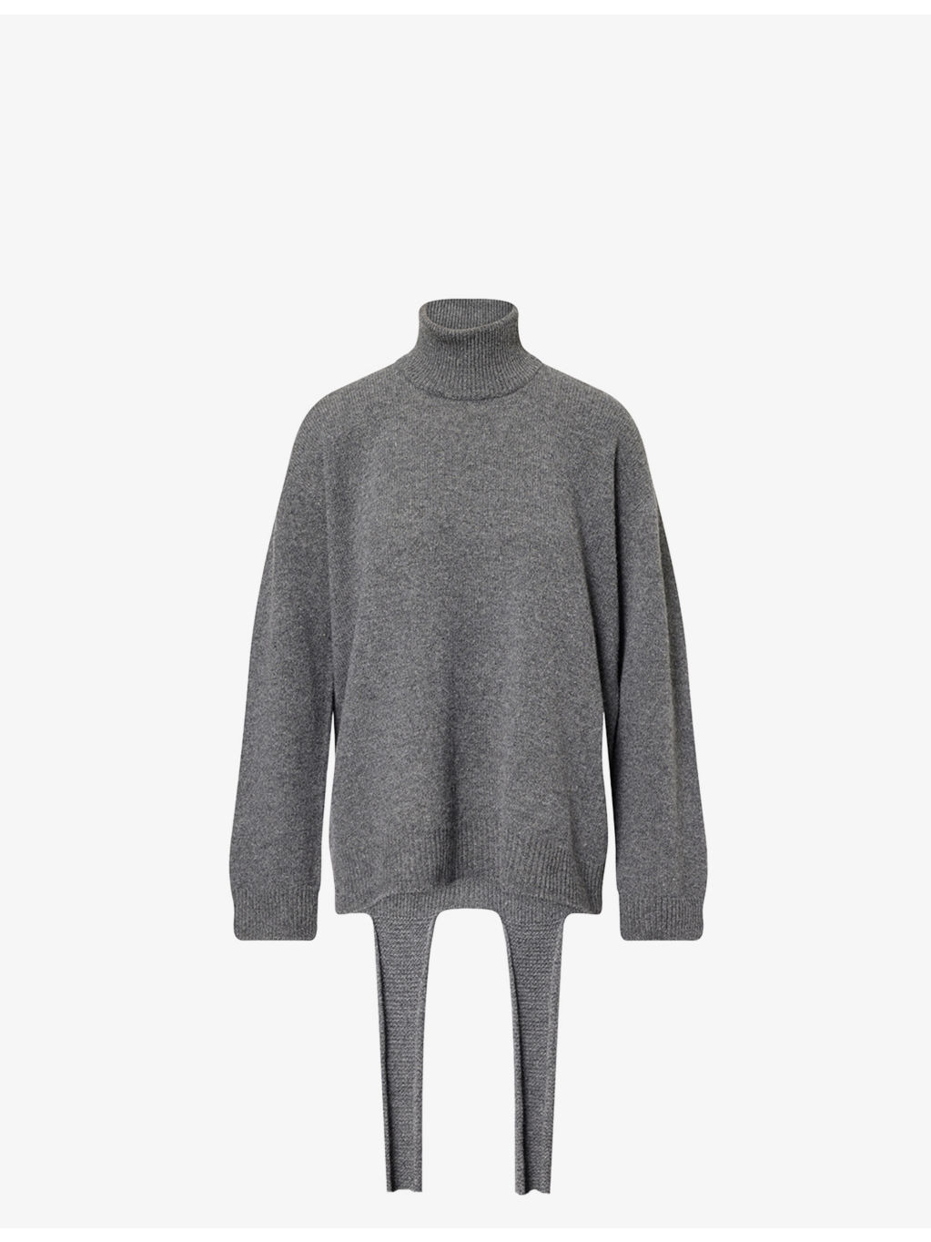 PRODUCT DETAILS - Issey Miyake wool jumper - 100% wool - Relaxed fit, ribbed high-neck, long sleeves, two panels at back, all-over knitted, dangling panels at hem - Dry clean - Made in Japan - Model is 5ft 10in/1.78m and wears a size 2 - Midweight, stretchy - The disclaimer has been tweaked slightly as we used to include a size chart in the product details, but this is no longer required as it is now built-in in the size guide online Ref: R04556775