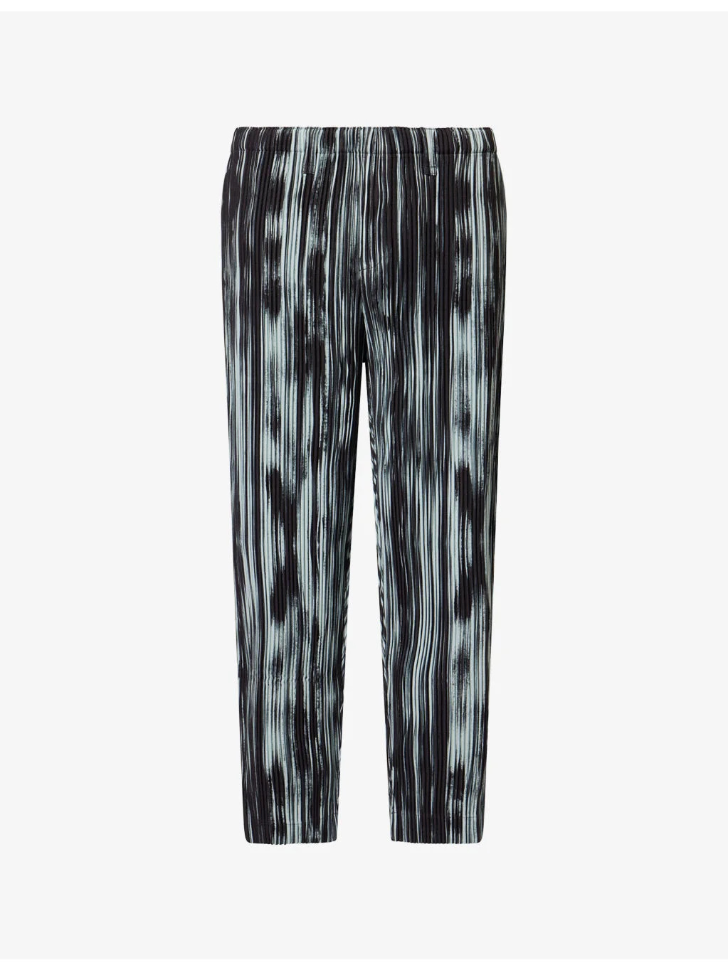 PRODUCT DETAILS - Homme Plisse Issey Miyake knitted trousers - 100% polyester - Regular fit, mid-rise, straight leg, elasticated waistband, belt loops, slip pockets at front, pleats texture, striped design - Machine wash cold - Made in Japan - Model is 6ft 2in/1.88m and wears a size 3 - Lightweight, stretchy - This garment’s sizing is based on height and doesn’t conform to standard sizes. Please refer to the size guide for your desired length. Ref: R04554100