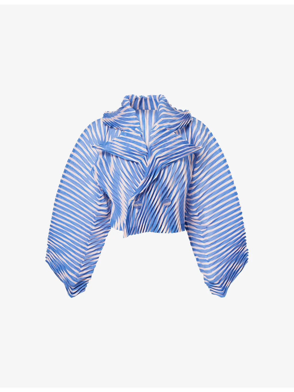 PRODUCT DETAILS - Issey Miyake knitted jacket - 100% polyester - Exposed button fastenings at front - Oversized fit, double-breasted, peak lapels, long exaggerated curved sleeves, cropped, all-over pleated, all-over stripe pattern - Machine wash at 30°C - Made in Japan - Size 2: length 20in / 51cm - Model is 5ft 10in/1.78m and wears a size 2 - Midweight, stretchy - This garment’s sizing is based on height and doesn’t conform to standard sizes. Please refer to the size guide for your desired length. Ref: R04556787