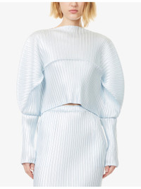 PRODUCT DETAILS - Issey Miyake knitted top - 100% polyester - Relaxed fit, curved design, cropped, straight-ascross neckline, long sleeves, all-over pleated - Machine wash at 30°C - Made in Japan - Model is 5ft 10in/1.78m and wears a size 2 - Lightweight, stretchy - The disclaimer has been tweaked slightly as we used to include a size chart in the product details, but this is no longer required as it is now built-in in the size guide online Ref: R04556784