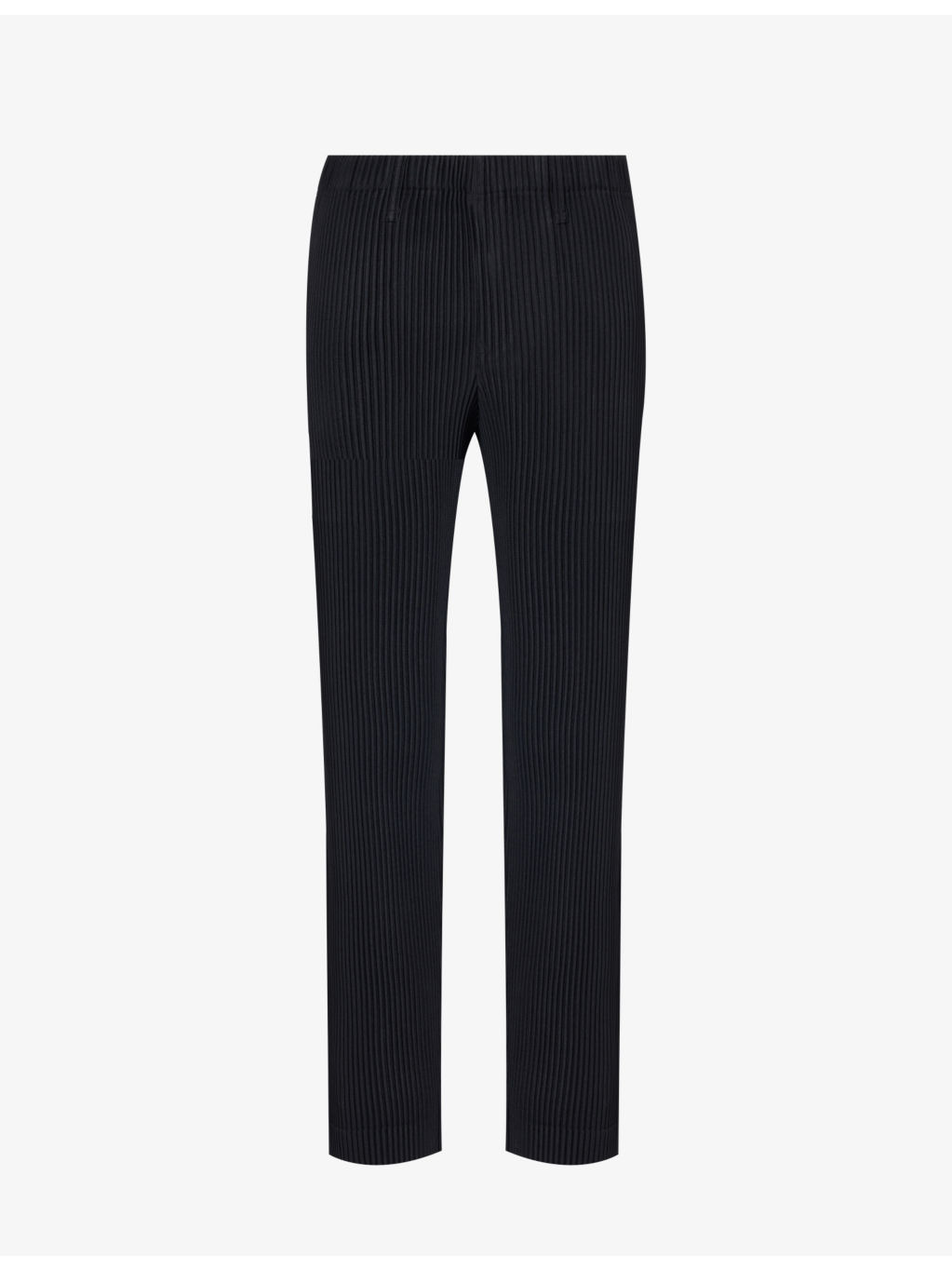 PRODUCT DETAILS - Homme Plisse Issey Miyake knitted trousers - 100% polyester - Pulls on - Regular fit, mid-rise, tapered leg, elasticated waistband with belt loops, slip pockets at front, all-over pleated pattern - Machine wash cold - Made in Japan - Size 3: rise 13in / 33cm, inside leg 28in / 71cm, leg opening 14in / 36cm - Model is 6ft 2in/1.88m and wears a size 3 - Lightweight, slight stretch Ref: R04281753