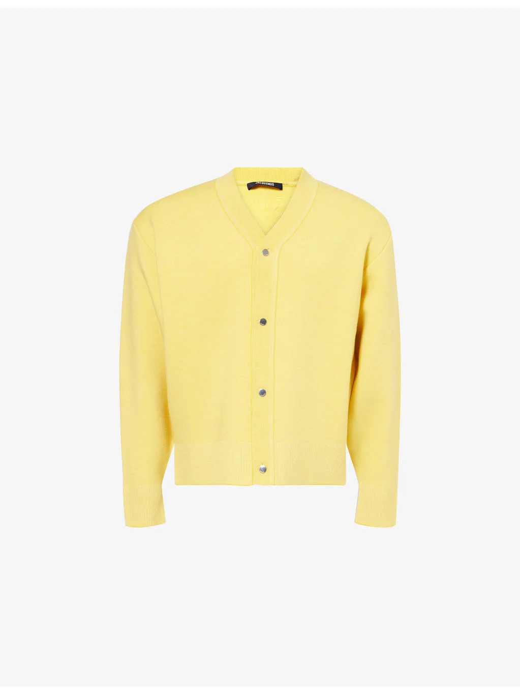 PRODUCT DETAILS - JACQUEMUS merino-wool cardigan - 96% merino wool, 4% polyamide - Button fastening - Relaxed fit, V-neck, long sleeves, branded metal buttons, ribbed trims, knitted - Dry clean - Made in Portugal - Model is 6ft 2in/1.88m and wears a size medium - Midweight, slight stretch Ref: R04568184