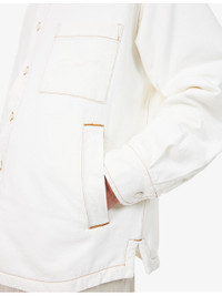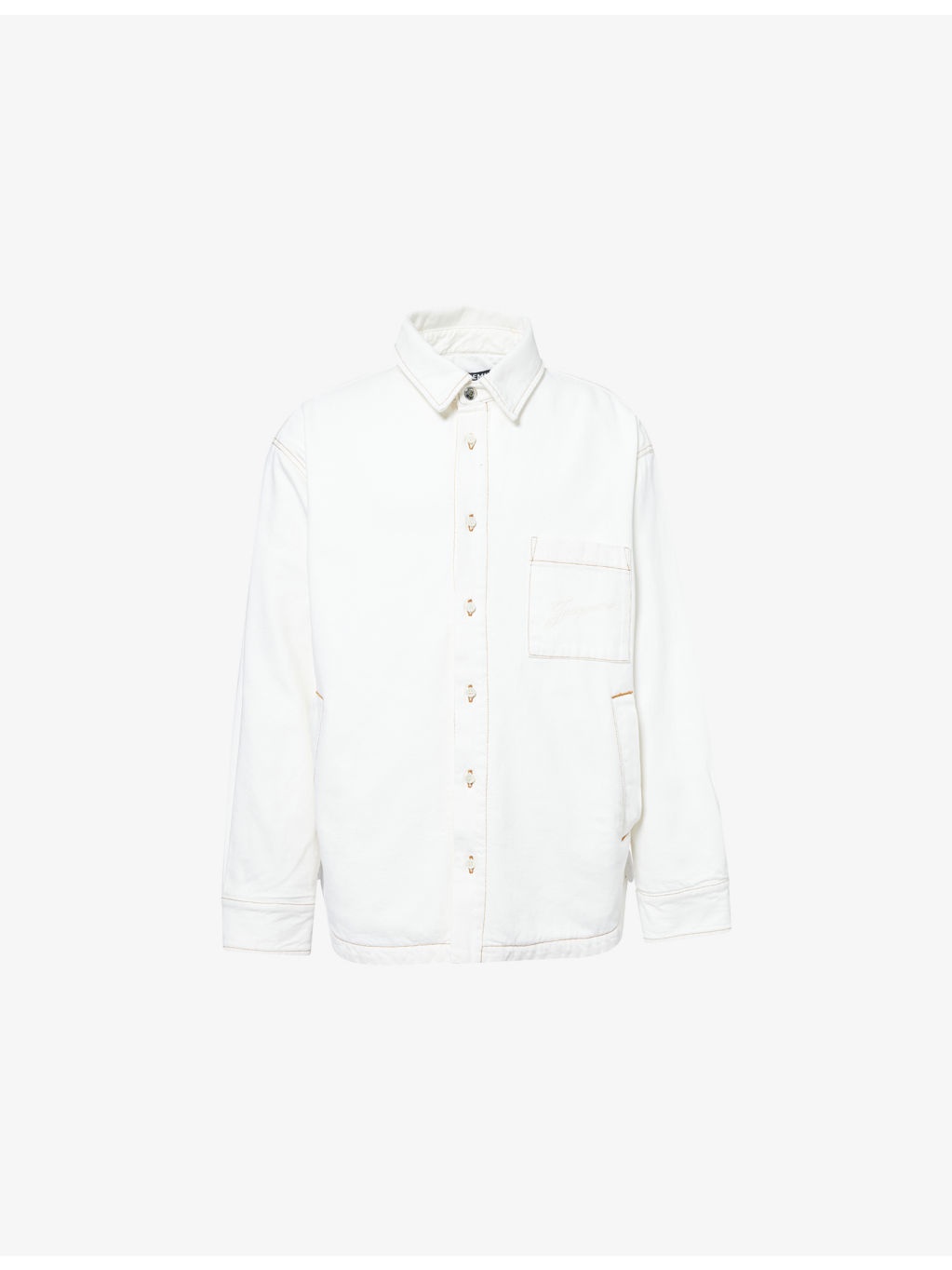 PRODUCT DETAILS - Jacquemus cotton jacket - 100% cotton - Exposed button fastening at front - Pointed collar, one patch pocket at front, embroidered logo at front, long sleeves, two slip pockets at front, buttoned cuff, all-over topstitch detailing, padded, fully lined - Machine wash at 30°C - Made in Portugal - Size medium: length 33.8in / 86cm, chest 51.5in / 131cm - Model is 6ft 2in/1.88m and wears a size medium - Midweight, non-stretch Ref: R04480312