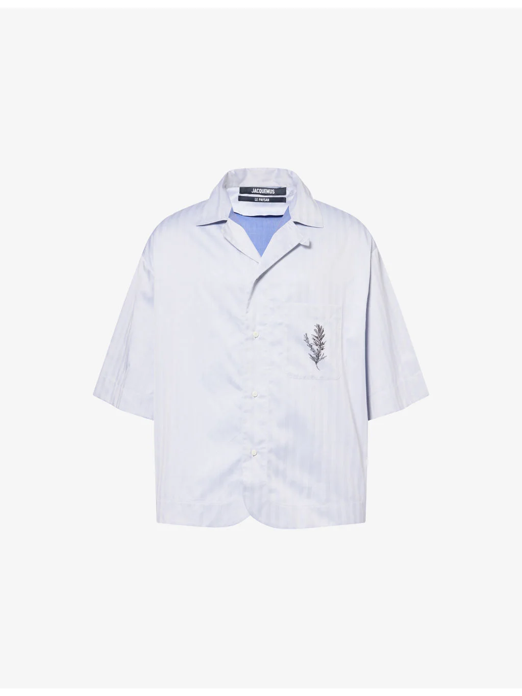 PRODUCT DETAILS - Jacquemus cotton shirt - 100% cotton - Button fastening - Relaxed boxy fit, convertible collar, short sleeves, motif print and patch pocket at chest, j-loop at back of collar, logo print at back, all-over pinstripe pattern - Machine wash at 30°C - Made in Portugal - Size UK 40: length 30in / 76cm, chest 56in / 142cm - Model is 6ft 2in/1.88m and wears a size UK 40 - Lightweight, non-stretch Ref: R04568169