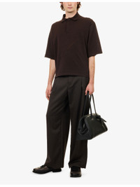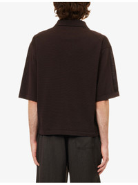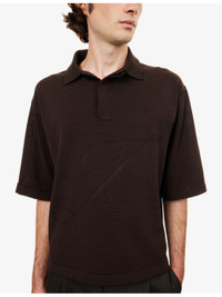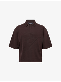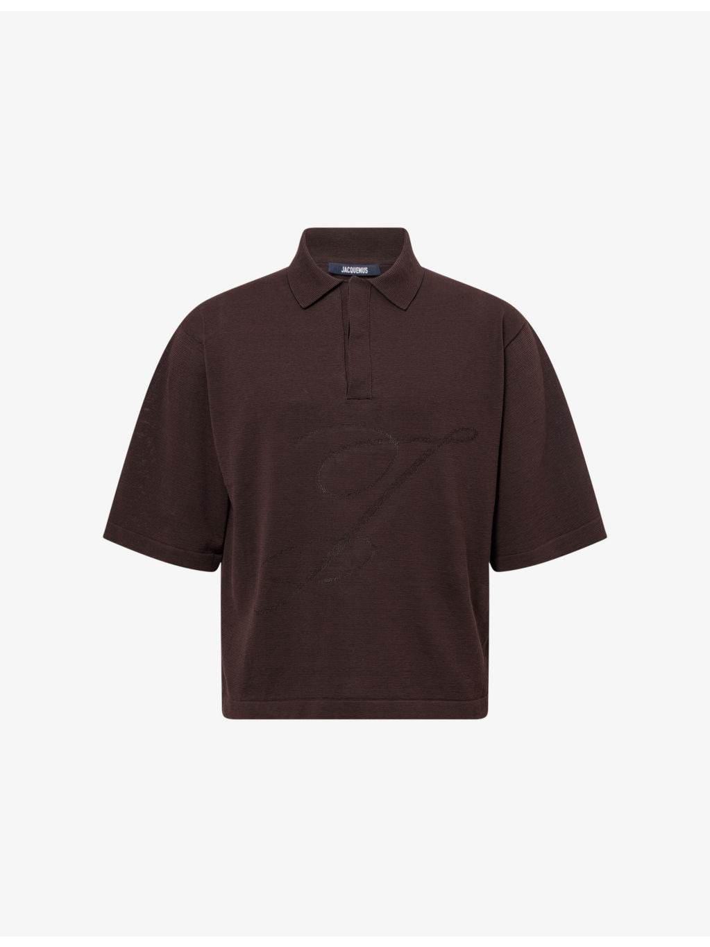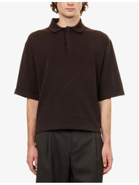 PRODUCT DETAILS - Jacquemus knitted polo top - 61% cotton, 35% linen, 4% silk - Concealed button fastening - Spread collar, short sleeves, embroidered logo design at front, all-over knitted texture - Hand wash - Made in Portugal - Model is 6ft 2in/1.88m and wears a size medium - Lightweight, non-stretch Ref: R04480320