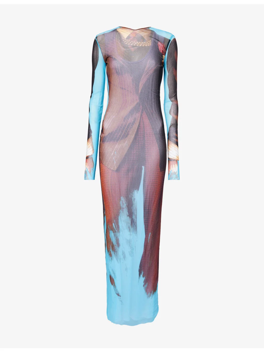 PRODUCT DETAILS - Jean Paul Gaultier woven maxi dress - 100% polyamide - Self-tie fastening at back - Slim fit, round-neck, long sleeves, open back, graphic print, all-over mesh texture - Hand wash cold - Made in Italy - True to size - Size small: length 58in / 5148m - Model is 5ft 10in/1.78m and wears a size small - Lightweight, stretchy Ref: R04571693