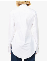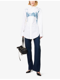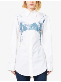 PRODUCT DETAILS - Jean Paul Gaultier stretch-cotton shirt - 97% cotton, 3% elastane - Spread collar - Buttoned cuffs - Slim fit, collar, long sleeves, bra and brand print at front, cinched waist, straight yoke at back, curved hem - Hand wash cold - Made in Morocco - True to size - Size UK 8: length 33in / 84cm - Model is 5ft 10in/1.78m and wears a size UK 8 - Lightweight, stretchy Ref: R04571689