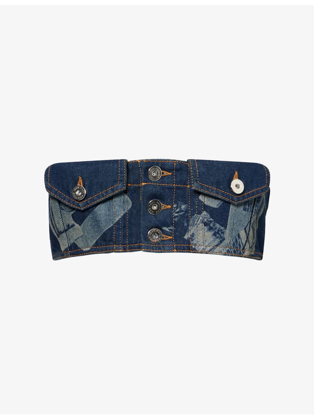 PRODUCT DETAILS - Jean Paul Gaultier denim top - 100% cotton - Button fastening at front - Slim fit, bandeau neckline, flap pockets and graphic print at front, cropped - Machine wash at 30°C - Made in Italy - True to size - Size small: length 4.5in / 11.5cm - Model is 5ft 10in/1.78m and wears a size small - Midweight, non-stretch Ref: R04571685