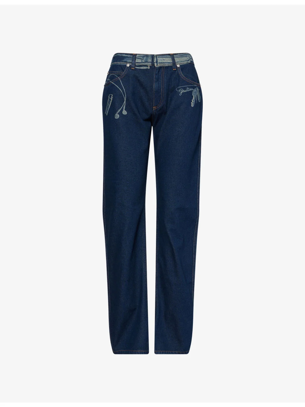 PRODUCT DETAILS - Jean Paul Gaultier denim jeans - 100% cotton - Hook-andeye and zip-fly fastenings at front - Regular fit, mid-rise, straight leg, belt loops, five pockets, graphic print at front and back - Machine wash at 30°C - Made in Italy - True to size - Size 26: rise 10.5in / 27cm, inside leg 33.5in / 85cm, leg opening 17in / 43.5cm - Model is 5ft 10in/1.78m and wears a size 26 - Midweight, non-stretch Ref: R04571683