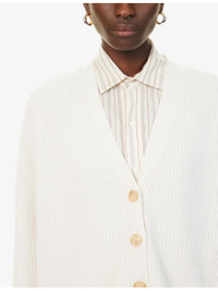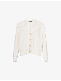 PRODUCT DETAILS - Jenni Kayne cashmere cardigan - 100% cashmere - Exposed button fastening at front - Relaxed fit, V-neck, long sleeves, all-over knitted and ribbed - Dry clean - True to size - Size small: length 24in / 62cm - Model is 5ft 10in/1.78m and wears a size small - Midweight, stretchy Ref: R04529895