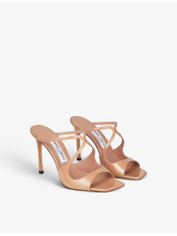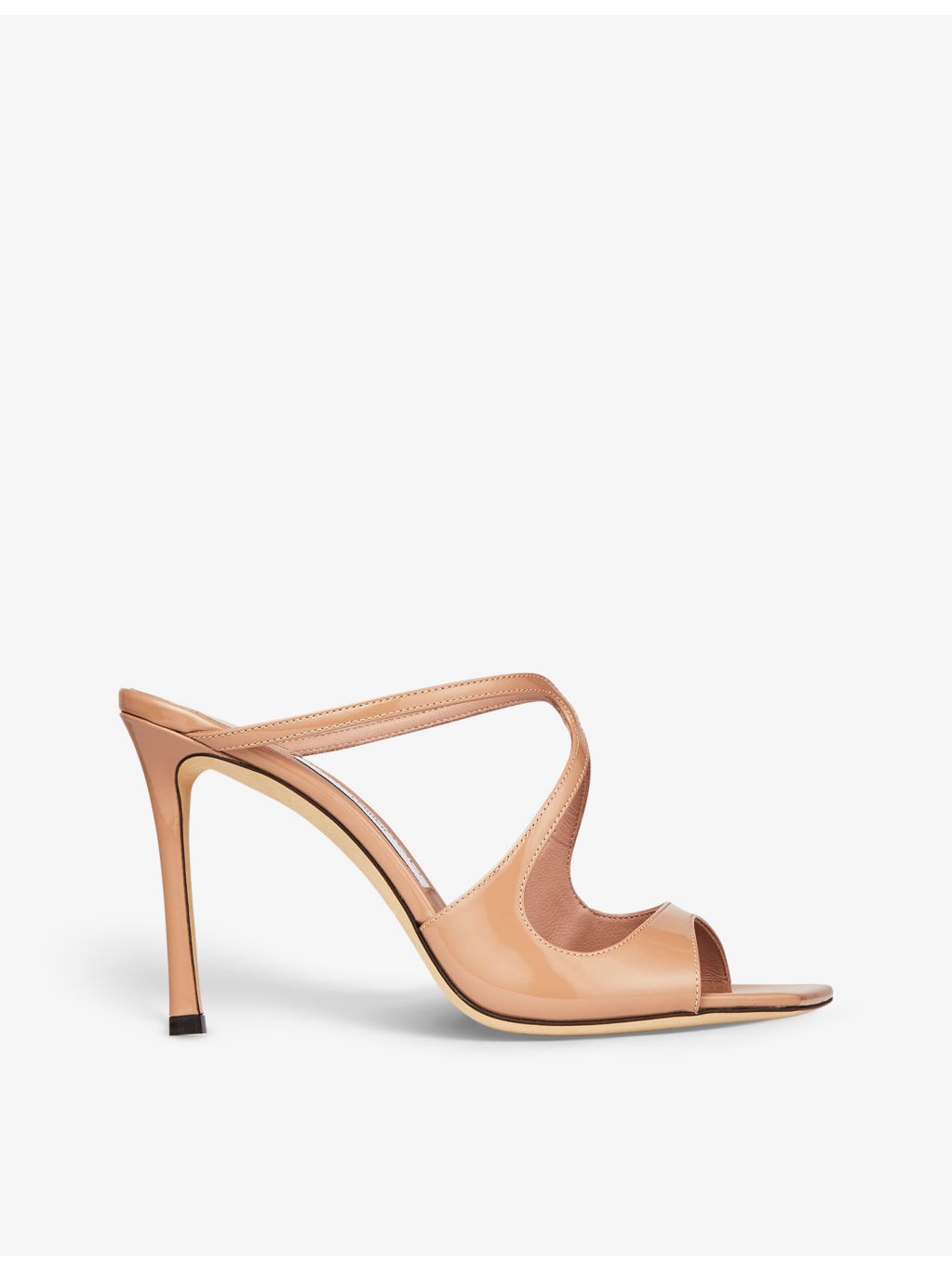 PRODUCT DETAILS - Jimmy Choo leather heeled sandals - 100% leather - Slips on - Open round toe, cut-out design, backless, stiletto heel, patent finish - Heel height 3.7”/95mm - Specialist leather clean - Made in Italy - Upper: 100% leather - Lining: 100% leather - Sole: 100% rubber Ref: R04153360