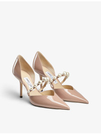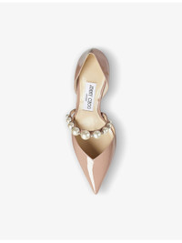 PRODUCT DETAILS - Jimmy Choo patent-leather courts - 100% leather - Slips on - Pointed toe, open sides, pearl and crystal embellishment, arch strap - Heel height 85mm / 3.3” - Specialist leather clean - Made in Italy - Upper: 100% leather - Lining: 100% leather - Sole: 100% leather - Fits small to size. We recommend taking half a size larger Ref: R03762899