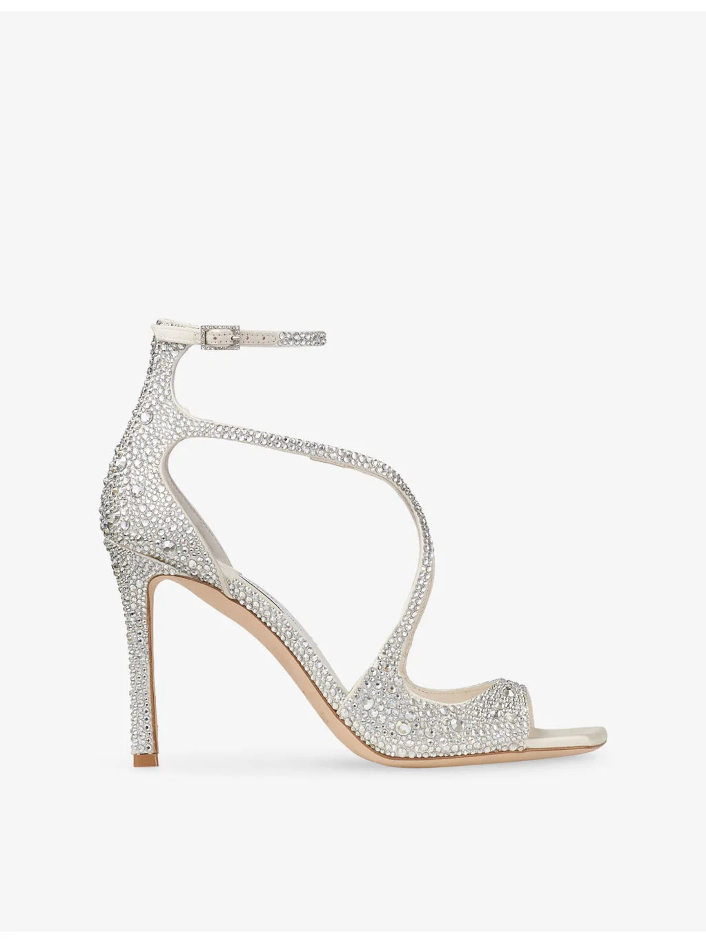 PRODUCT DETAILS - Jimmy Choo satin heeled sandals - 100% crystal-embellished satin - Ankle-buckle fastening - Square open toe, closed back, curved double strap design, slim heel, all-over crystal embellishments - Heel height 95mm / 3.74in - Wipe with a clean, dry cloth - Made in Italy - Upper: 100% lamb leather - Lining: 95% textile, 5% leather - Sole: 100% leather Ref: R04549716