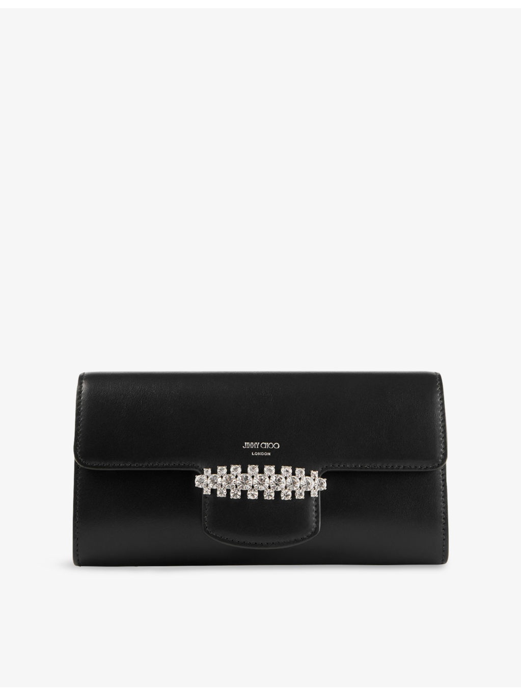 PRODUCT DETAILS - Jimmy Choo leather wallet-on-chain - 100% leather - Pressed stud fastening - Rectangle shape, chain shoulder strap, crystal embellished motif at front, internal slip compartment - Length 19cm, height 10.5cm, depth 4cm, shoulder strap drop 51cm - Wipe with a clean, dry cloth Ref: R04472935